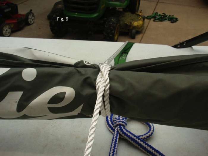 After forming the boom hitch, I now feed the line from the port side of the trailer over the top of the cargo over to the starboard side so I can secure the sail bag. As shown in Fig. 6, on the way from the port side of the trailer over to the starboard side, a clove hitch is formed around the sail bag. This is an important part of the system to hold the sailbag where I want it. The clove hitch around the sail bag is snugly tightened at this stage, but otherwise the line portions leading to the clove hitch and away from the clove hitch are not tension yet. I position the clove hitch so the sailbag is about 16 inches over from the port gunwale. This is off-center. I can’t center the mast on this boat due to mast support hardware in the center. Everything will snug up further when the whole system is tensioned. To tie a clove hitch.