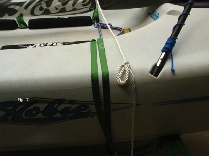Below, I’ll show how to tie this version of the trucker’s hitch in the context of securing a mast on a trailered Hobie Bravo. NOTE: Although I used this ratcheting hitch to secure my mast to the hull, I still use 4 ratchet straps through scupper holes to hold the boat on the trailer securely. Why? Ratchet straps are so much stronger than all but the thickest line.