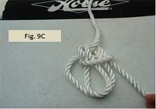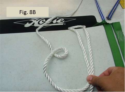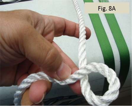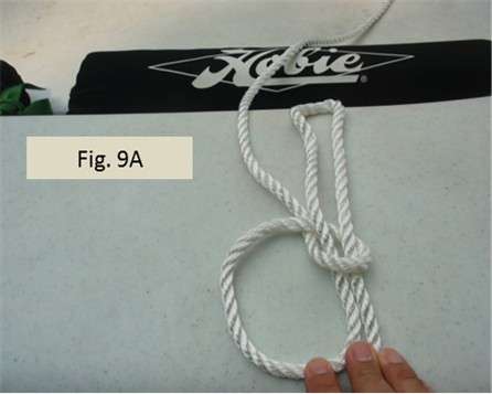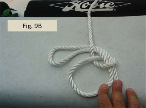 Figs. 8A, 8B, 9A, 9B, and 9C show how to make the bowline with two loops. Start by forming a little loop. In knot books, this little loop is sometimes called the rabbit hole. In 8A, the line running across my index finger is the line coming from the port side. The line going across my ring finger and bandaged pinkie is the pulling end that I will later pull to tighten things up and then tie off. Note the pulling end is on top of the little loop I am forming. As shown in 8B, I will also form a bight (open loop). In Figs. 9A, 9B, and 9C, I lead the bight loop up through the small loop (rabbit hole), then around the back of the line coming from the port side and back toward me, and then back down the little loop (rabbit hole). The two bowline loops I end up forming don’t need to be big, but they should be close in size. I make sure the bowline is good and tight. I should be able to pull on the loops, the line coming from the port side, and the pulling end (which is the free end) without the loops changing sizes.