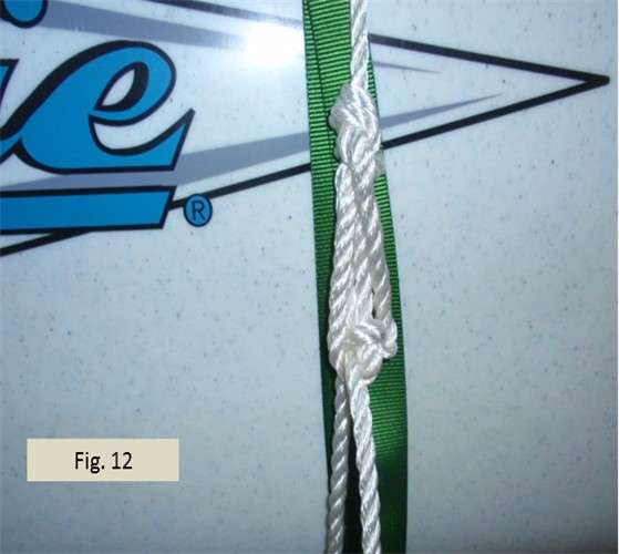 Fig. 7 shows the double-loop bowline knot I form as the next part of the system. The two loops need to be as close in size as I can get them, as these are part of the ratcheting system. Note that after being formed, the bowline is positioned at the gunwale. This is where I want it. Form it too low down the hull side and I might not be able to draw the line tight enough. Too high, e.g., up on top of the hull, and it’s a little harder to draw the line tight like a drum. This knot only needs to be tied once during set up. When taking the mast off the trailer, I leave this knot in place so tying down the mast next time takes very little time.