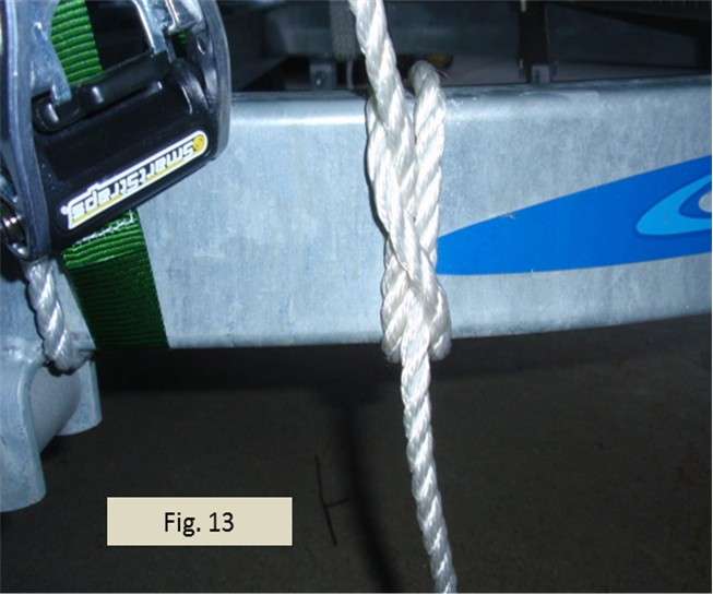 In Fig. 12 I’ve pulled the line over the cargo very tight using the ratchet and pulley action. I’m not holding the pulling line, but the ratchet effect holds everything over the cargo in tension. The tail of the pulling line coming out of the ratchet knot is still slack, though, because I have not yet tied it off. I now need to tie off the end of the pulling line tautly to the trailer so that the ratchet knot cannot release and the tension is secured. Note that the part of the line holding the cargo is already fully tensioned. We’re not making that part of the line tighter at this stage. We’re just securing and tightening the tail end of the pulling line so the ratchet can’t come undone and release the cargo tension.