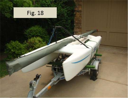 Fig. 18 shows the mast secured to the boat in a nice tidy package. Note I’ve used two lines, fore and aft, to secure the mast. Both lines are tied the same way using the ratcheting truckers hitch. Both lines are secured around the sail bag using a clove hitch. The two lines are drum tight. The sail cannot move side to side, up or down, or fore and aft. When I put the boat in the water, all I have to do is release the clove hitch on the starboard side of the trailer, release the ratchet knot, and remove the clove hitch from around the sail bag. I leave the bowline in place and leave the boom hitch tied to the port side of the trailer. Then, putting the mast back on the boat goes very fast.
