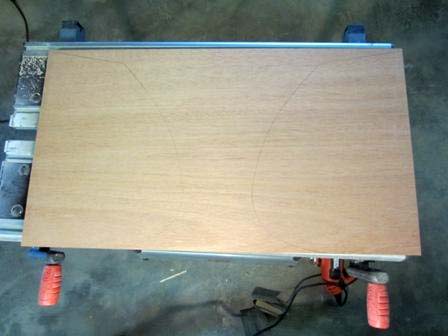 ½ inch mahogany board marked for cutting using the template. When cutting remember to "leave the line". It is hard to see the lines, but they are there. It is impossible to cut a perfect line with a jigsaw, at least this is my experience, but do the best you can.