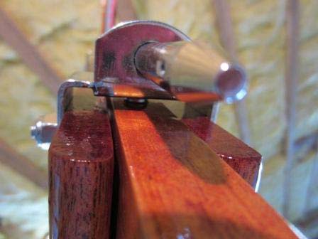 11. Attach brass screw eye, cam cleat, tube clip and tiller extension to tiller. Attach the hiking stick 11 inches from the user end (drill holes and through bolt with 2 SS 10x24x2" bolts and nylock nuts.). Attach the tube clip 15" back from the base of the tiller extension base, secure with 2 SS #6 x ¾" machine screws. Attach the clam cleat 14 ¼ inches from the user end (drill pilot holes and secure with 2 SS #6x3/4" machine screws). Finally attach the brass screw eye 17 inches from the end. Attach the tiller to the rudderhead assembly. Run the uphaul and downhaul lines through the screw eye and add parrel beads to the user end to facilitate gripping the line.
