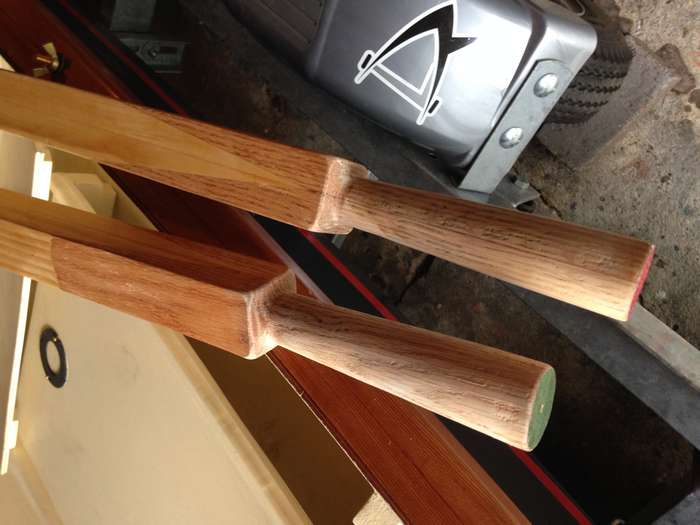 But in testing the new oars, I found the shape of the handles very (VERY) uncomfortable. I decided to replace the handles with new handles.