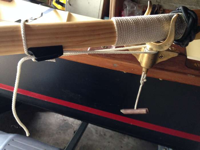 The picture below shows the Turks Head stop, how the adjustable stop clamcleat is mounted on the bottom side of the oar with the line looping around the lock and back to a loop around the oar, jammed against the clamcleat, tied with a 'Poacher's hitch'. The toggle hanging below the lock is a 7/16" cylinder, bored down the center to take a short piece of the polyester line. A slot is cut half the length of the toggle to enable it to pivot and prevent losing the lock.