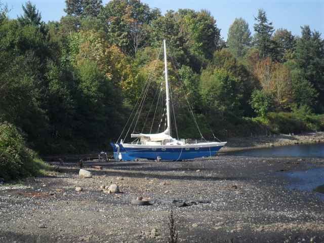 I was walking down the beach at Dead Boat Cove, not its real name just my appellation, the locals call it Dogpatch, when I noticed this Wharram design catamaran beached for work on the hull. The owner, Tom Hembroff, hauls her up every two or three years for bottom painting etc. Her name is Piggy, reasons not provided.