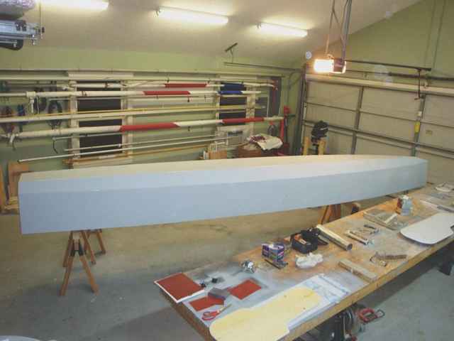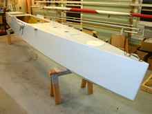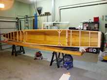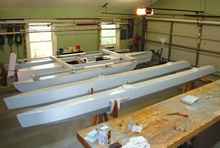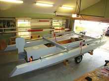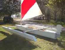 All of this brings me to introduce to you my latest trimaran creation: a 19-footer with a 14’ maximum beam and 18’ outriggers, or “amas” (as we trimariners like to call them). Here are a few late-stage construction photos that show just how lightly built this boat is.