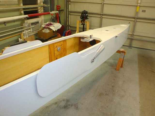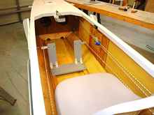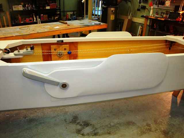 One aspect of this trimaran design that is (as far as I know) unique, is that it has a sliding “main” seat that allows the boat to be perfectly balanced whether sailing solo or with a friend. This was not the easiest thing in a boat with foot-pedal steering, so I had to devise a sliding seat on a track that also included the steering pedals.