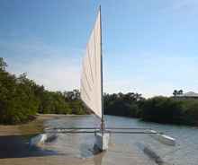 The sail is assembled just like a fan, with four battens radiating out from the tack. It’s laced to the boom at the foot and to a “luff spar” which more or less becomes the mast when hoisted vertical by a halyard attached about ½ way up the and run over a sheave at the top stub mast. Sounds complicated, but very simple to rig.
