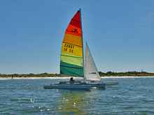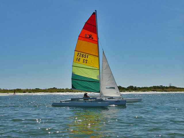 This is the “sloop rig” version, and allows about 150 sq ft of sail to be spread. It consists of a Hobie 14 main (118 sq ft) and a Laser II jib (about 32 sq ft). It is the only “stayed” rig I’ve ever used on this boat. It’s probably the best upwind rig, and possibly the fastest as well.