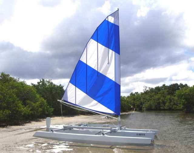 So there you have it: One boat that seats two, has three hulls, and has had four different sail rigs. In the end, the blue and white sail won out. It’s easy enough to reef if the wind picks up, but also a great performer in light air. Rigging is quick and easy, and sailing is an absolute blast!