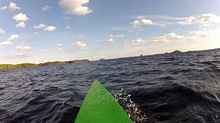 Next I have to go around a narrow peninsula and surf downwind to an open lake. Paddling downwind with small flat bottom kayak like this is fun. When I pass the peninsula I just have to paddle downwind over waves - no turning back. I fly near shallow waters and pitfalls, but I manage to go around them and head towards open water. First it was a bit scary, but quickly I found myself on opposite shore behind the island - It was fast ride and real fun!