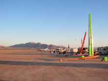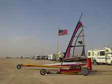 I roll onto the playa late Friday afternoon, there's breeze, and I commence to assemble the Rocket. Lots of sailors are already established here in camp, and many hands are available for the task. She comes together just prior to sunset, and with it the wind moves elsewhere, but I can retire knowing that I'm ready for action.