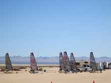 Dawn offers up glorious sunshine, a much appreciated commodity for a boy just escaping a Pacific Northwest winter. Out come the tools and the myriad pieces of the little boat, and the puzzle comes together. Today's the tune up day, so I join the brethren scampering across the lake bed, returning frequently to make adjustments. The temps rise into the 70s, the boats are running well, and I'm settling deep into contentment. A grand beginning. Official racing got underway on Sunday, there's moderate air, and the race committee efficiently spools thru two complete rounds of races. We've got eight classes run in five starts, from the flourishing mini class with it's open box rule and innovative home builds, to the well represented and fiercely competitive Mantas, singles and doubles, and on up to the sophisticated big boats, capable of speeds into the seventies and eighties given the right conditions. Excitement on offer for every taste!