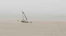 It's blowing 20 to 25 by dawn, and with the mercury barely breaking into the forties, I scrunch a bit deeper in the bag and wait for it to warm some. It does so, and rigging commences. Up goes "the Handkerchief", my smallest sail, 2.5 meters, reserved for just such days! I launch onto the empty playa, and hang on!