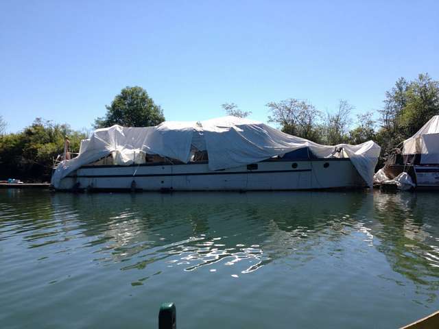 I knew this boat as The Widgeon... and while she was afloat I thought she'd be the perfect boat to convert into a home. Not gonna happen, as she's been under water quite some time now.