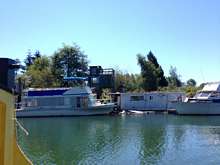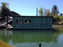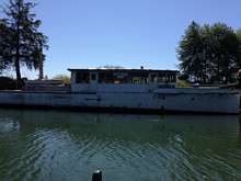 A houseboat. Seems occupied, but I don't know if that's full time or part time. It was either used for storage or was a rather messy place to live.