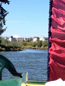 For lunch on day two I tied up to a piling, Mediterranean style, one end tied to the piling and the other held in place with an anchor. The helps keep the solar oven lined up. You can't really step out on shore, as the mud is very deep. You can only get out at high tide, when you can step onto the grasses.