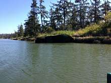 Soon, I was threading my way through a forest of pilings, clearly a part of the abandoned sawmill barely visible in the overgrown shrubs along the shore. These pilings are a real danger, as many are rotted off just below the high tide line. I've hit more than a few as I motor along, which is part of the reason I move so slowly here.