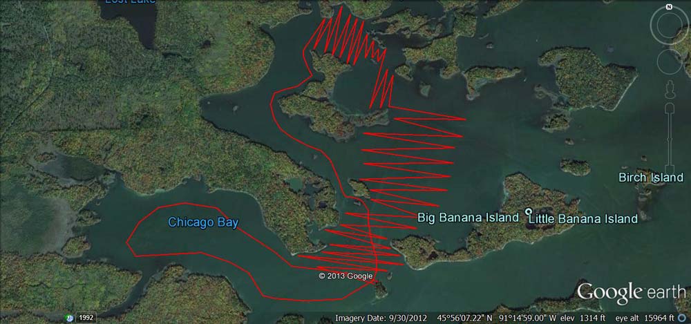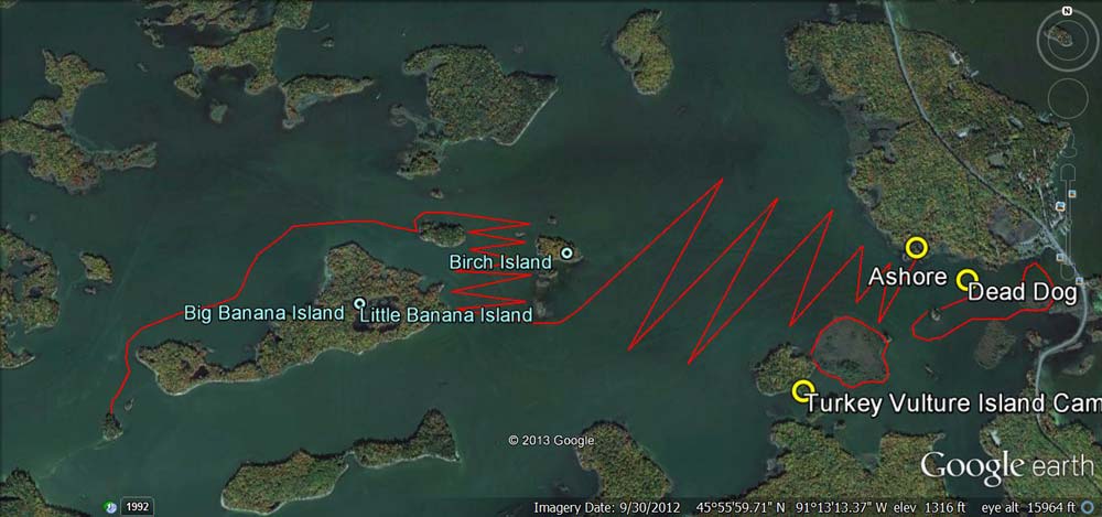 Trapped ashore at the northern edge of Dead Dog Bog. The "islands" outlined in red are the floating bogs described later in the story. An extremely strong southerly wind has us pinned down, unable to make windward progress. |
