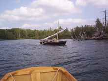 I'm about to give up when my brother suggests a tow. I tie a line to Jagular's mast and toss the other end to him. He cleats it off and starts to row up the narrow channel, dead into the wind. I manage to provide a feeble rowing assist when I'm not re-tying bungees. With both of us rowing we're able to finally make it through the last stretch. We've escaped from Dead Dog Bog. A little farther on we beach the boats again to wait for the wind to die down.