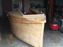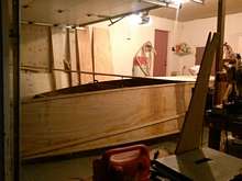 Major progress - we put the bottom panel on the hull last night. I preassembled the entire bottom panel using fiberglass tape so I wouldn't have to live with wooden butt-blocks on the floor of my boat. The downside to this approach is the entire panel has to be attached in a single operation. I was able to break the operation into halves by supporting the forward end above the hull while gluing and screwing the back half. |