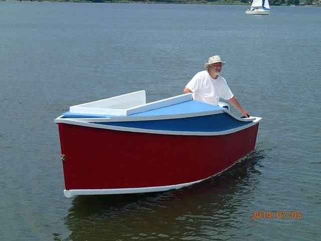 Puttin' along with minimal wake. I was disappointed with how the 10hp labored to get the boat on plane with nothing but me and 2 gallons of fuel aboard. I see a new 20hp in my very near future. |