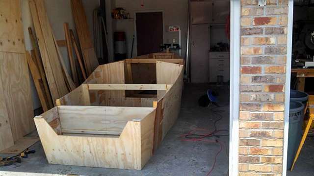 Starting to look like boat. Frames and sides assembled with deck screws. Next step is to glue each bulkhead permanently. Will coat bulkheads with epoxy and 4oz fiberglass to prevent plywood checking. |