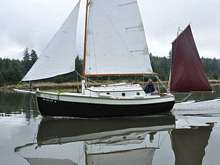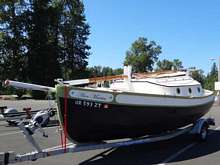 It's not a hard boat to sail overall although it took us some time to learn how to handle the novelty of a mizzen sail. The spanker is actually quite powerful and the bumpkin broke the first time out. I also designed and ordered a topsail, and look forward to trying it out. Overall, it's a big stable boat and it conveys confidence and security. The centerboard is useful in the shallows and the flat bottom makes beaching or being stranded on tidal flats uneventful. It tacks easily, points reasonably well for a gaffer, and is fast enough for cruising. The main drawback is set up time from trailer to water, which can be over two hours and makes it a poor choice for day sailing. It's a two person coastal cruiser, and in that role it does very well.