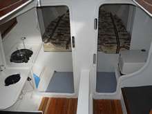 The V-berth is double bed size in width and has sitting room. I circumvented the placement of the mast compression beam in the middle of the berth, required for the yawl, by placing the mast on top of a compression box that wraps around the berth and transfers compression to the keelson but keeps support out of the sleeping area. That attempt at engineering has worked out well and there has been no detectable movement. The cabin can sit up to four, and there are two long quarter berths, usable for storage. There is a semi-private head, an adequate galley, and a lot of room for storage of clothing, food and cooler. Staying aboard for a week is not a hardship. In the cabin, I opened up both sides of the berth. The original design called for a single starboard entrance, but that configuration was too awkward for us. Whoever slept portside would have had to crawl over the other person to get out.