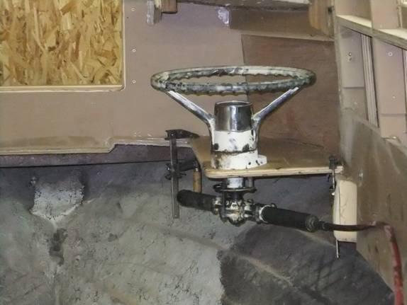 The dang thing started out, being pretty clean and painted white. A regular tar baby kind of project. I looked a lot worse than the steering wheel by the time things settled down. The idea is to stand next to this setup and steer with a "suicide knob." Should even be able to stand in the open hatch up forward and reach the wheel back inside the pilot house. And, there's a few more twists and turns that I've dreamed up in the Moaning Chair. Of course, some more of the boat-parts that I have labored to fit and glue and screw into place over the past weeks, got lopped out. Once that sawzall gets to running, there's little stopping it.