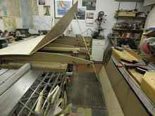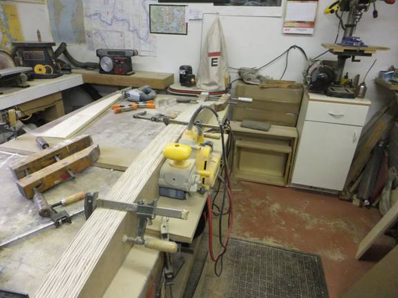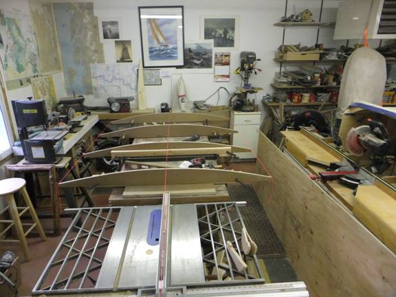 The set of 4 deck beams - with several more to make after I figure out what they’re supposed to look like. Cut out of ¾” MDO, and shaped with a saber saw and belt sander. I discovered - again - that the pine pattern that I carefully crafted with a thoroughly deliberated fair curve, is not only easy to shape, the router-laminate trimmer bit’s bushing eats it up quickly too. I later remembered that the last time I did something like this, I used Masonite for the pattern. So much for the best laid plans…