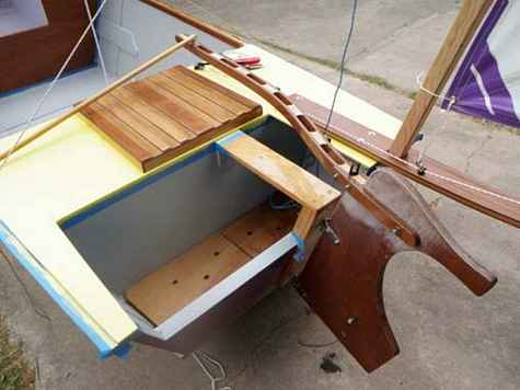 The canvas stadium seating is easy on your bottom and provides a great foot rest. The rudder is offset 6" to move the rudder away from the engine and the tiller is curved to make it easier for Rosa to steer on starboard tack. The curved shape allows the tiller to miss the power head of the engine and the mizzen mast when steering the boat. |