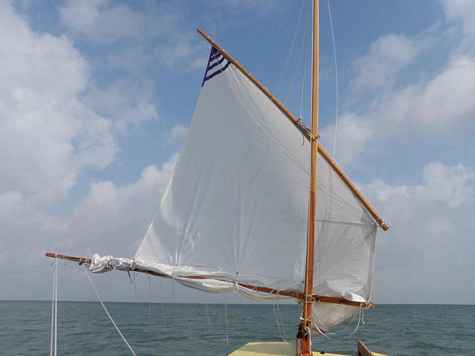 This is the balanced lug rig with the #3 reef tied in and halyard attached at the correct location on the yard. Sails are homebuilt from a Poly Sail International kit. |