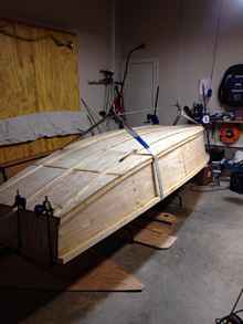 The boat was framed and needed a bottom. Instead of gluing the bottom on one piece at a time, I glue the three pieces of ½" marine plywood sheets together with two 1 x 4's. After a couple three days, I took the boat frame outside and laid the bottom over it, traced a generous line and cut it out. I screwed it down with regular drywall screws and let it set for a couple days so it could assume the rocker of the frame. Long story short, the glue went on and the screws were replaced with stainless steel exterior wood screws. I was done with the bottom!