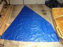 I started looking on Duckwork's for pre-made sails and sail kits and decided to make my own. After all, if you can build a boat then you can probably make your own sail, if you know how to sew. I did fortunately! I bought a cheap $20 blue poly tarp from Lowe's and laid out my pattern. I will say this, buy the book Boat Building for Beginners, it was a great resource to me on sail making. I laid out the design on the tarp and cut it out. I had to read that section of the book about three times to figure out which way to swing the radius, but I got it. Everything marked, now I was ready to "adjust the pattern". I had no idea what a "round" or "hollow" was before this but I do now. I used a batten I cut off of a 2 x 4 x16 and it worked perfectly.