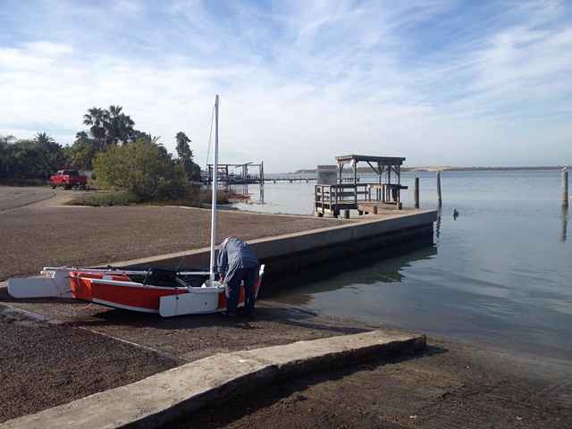 By this point I was beyond excited! I had everything ready to go, rigged, painted and all I needed was an excuse to go sailing. Well I found one! The 4th annual New Year's cruise hosted by Stan Roberts. It was a great little two-day trip to test out the boat. I called my dad and asked him if he wanted to keep me company on the maiden salt sail. We headed down to Ingleside by the bay and pulled her out of the truck and pushed her in the water.