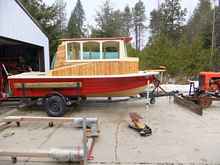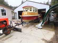 This was that unbudgeted, unplanned, but certainly not unloved boat project that was "allowed" a six week nitch on the building schedule. That was back in November. Somehow, six weeks turned into four months. But, after a great deal of fretting, and even more grunting and groaning, Roughneck emerged from the shop today and reluctantly clambered on to her trailer.