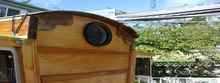 Nobody ever accused me of being a photographer. I haven't let that stop me and present here some snaps of my efforts this summer. The roof and hatches came first. They should have probably followed the tabernacle, not preceded it. However, I didn't plan on a tabernacle until the mast snapped, but that's another story. I'll get back to that later. The roof and hatches were constructed of cedar strips a la stripper canoe style with cove and bead edges. The hatches were constructed first as one large piece and then the roof section was built on top of it to get the mating curve. Next the hatch was cut into two equal length pieces. The hatches slide on aluminum angles fastened to the slot top rails. The roof is fastened with hooks on one side and loose pin hinges on the other rail. It is removable. The black coloured gaskets between the roof and the hatches were carefully designed by General Motors and came from a 2002 Oldsmobile that was languishing at Ralph's Pick-A-Part. They started life as weather strip around the doors and have proven to be effective on a boat as well.