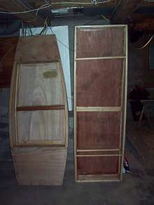The man spent a few days gluing more wood to the plywood. Then he set some of the pieces of plywood on the wooden frame so they stood upright.