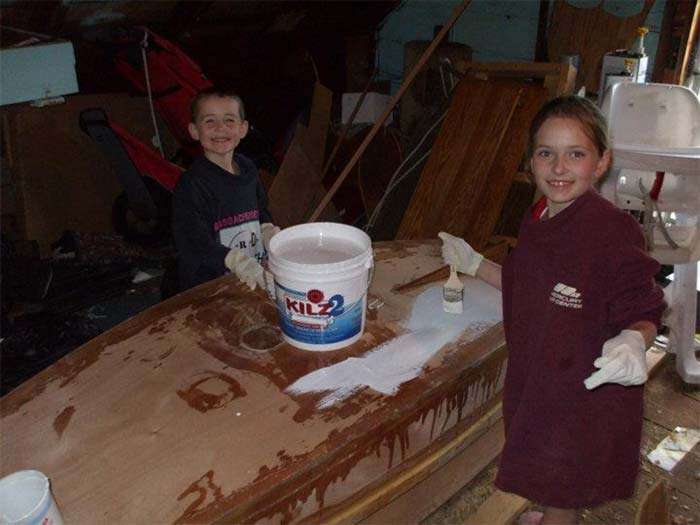 Then Abby and her brother came upstairs. They were dressed a little funny in big shirts that went to their knees. Abby began to spread white paint all over Seagull, Abby's brother did also.