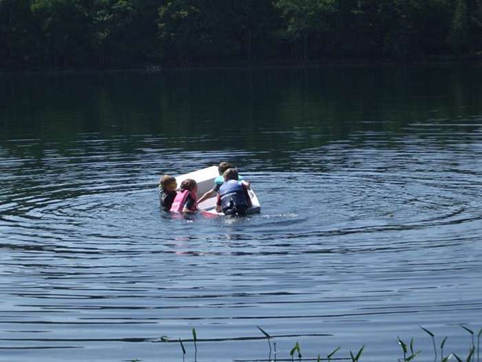 The wave he set up caused Seagull to fill with water! Good thing the kids all had their life jackets on!
