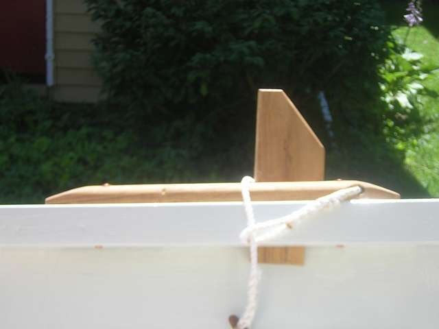 There is an ongoing debate among the clubs about length; we made ours 11' at the bow and stern and 11'10" at the middle two stations. The club rules specify no fancy metal oarlocks, and the plans show the Iron Age routh and kabe design, a pad with an upright block mortised into the rail. The oar has sacrificial wood boards (sclates) that bear on the pad and upright, and is held in place with a lanyard (humbliband in old dialect).
