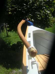 One of my crew is an artist (SOTTILESCULPTURE.COM) who had his way with the tiller, steam bent oak with a pegged through tenon.