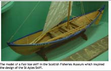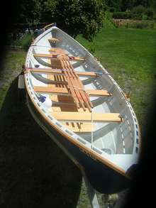 This boat was created as a community rowboat in 2009 by the Scottish Fisheries Museum and designed by Iain Oughtred, based on the old Shetland fishing boat, the Fair Isle skiff.