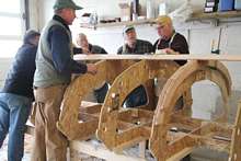 The planks are pre-spiled, but one still has to use arcane methods to fit the rolling bevels. Here we use a magic batten painted with flat black paint to determine the tricky bevel at the keelson/stem transition. The batten is rubbed along the lie of the plank and the black paint is planed off.