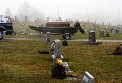 'GONE FISHING' - A man who loved the outdoors was carried to his grave in a boat pulled by a truck on Wednesday. The casket of 78-year-old Ronald Bloss Sr. was loaded onto a small motor boat and trailer and pulled to a cemetery by a pickup truck driven by one of his five sons. Bloss loved hunting, fishing and spending time on rivers with his many boats, so family members came up with the idea of using one for his final journey.