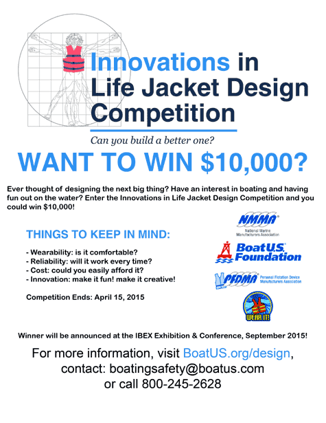 ANNAPOLIS, Md., August 21, 2014 – Are you an armchair inventor with a better way to keep boaters, sailors and anglers afloat? The BoatUS Foundation, along with the Personal Floatation Device Manufacturers Association (PFDMA) and the National Marine Manufacturers Association (NMMA), have teamed up to seek out the newest technologies and design ideas with the “Innovation in Life Jacket Design Competition” which kicks off today. “We believe there are some creative folks out there that can help us rethink a 100-year-old design with fresh, out-of-the-box ideas,” said BoatUS Foundation President Chris Edmonston. A $10,000 cash award goes to the winning designer and inventors have until April 15, 2015 to submit their idea to www.BoatUS.org/design.
