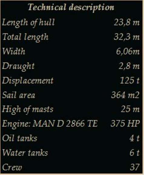 Although La Grace is built in such a way that even admiral Nelson will not recognize any historical inconsistency at first sight, inside she is equipped by all the modern electronics, safety systems and equipment which will allow her to sail safely and also provide the crew by comfortable environment for relaxation or training.
